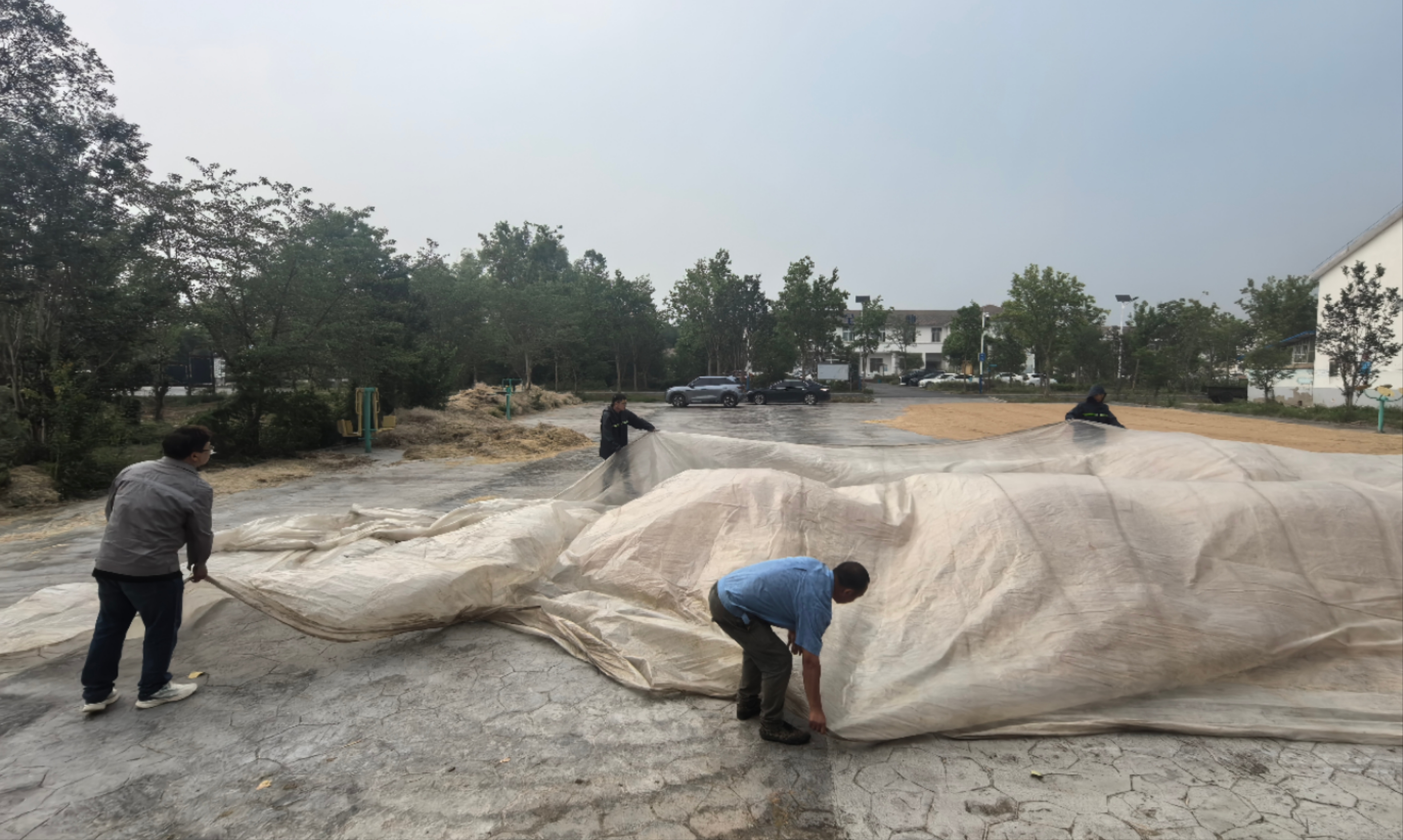 志愿者們拿起推糧鏟、鐵鍬、大掃帚,對糧堆邊緣散落的小麥進行集中歸攏,并迅速用防水雨布對糧堆進行覆蓋,有效防止因雨水滲透導(dǎo)致的糧食霉變損耗風險。